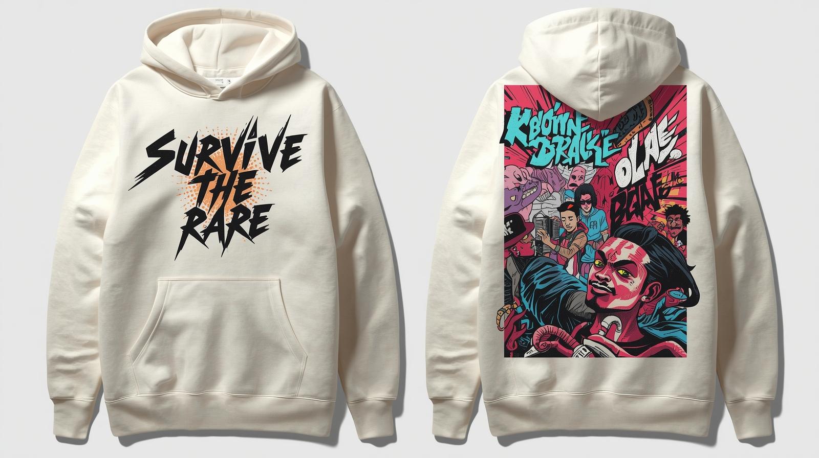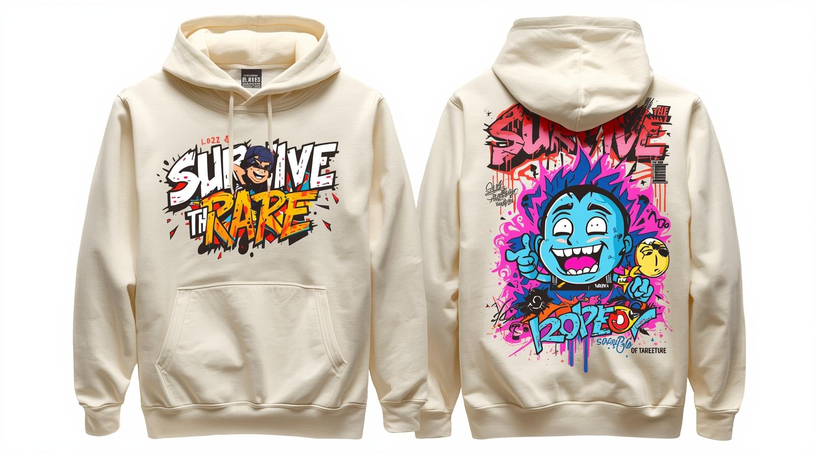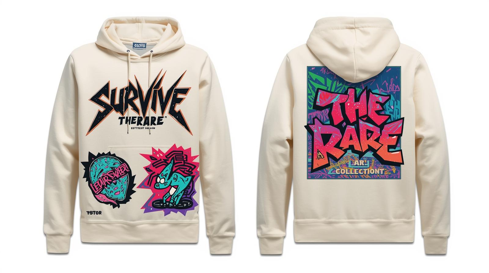 Limited-edition cream hoodie with “Survive the Rare” graphics. Soft, stylish, and rare Nebrya streetwear.